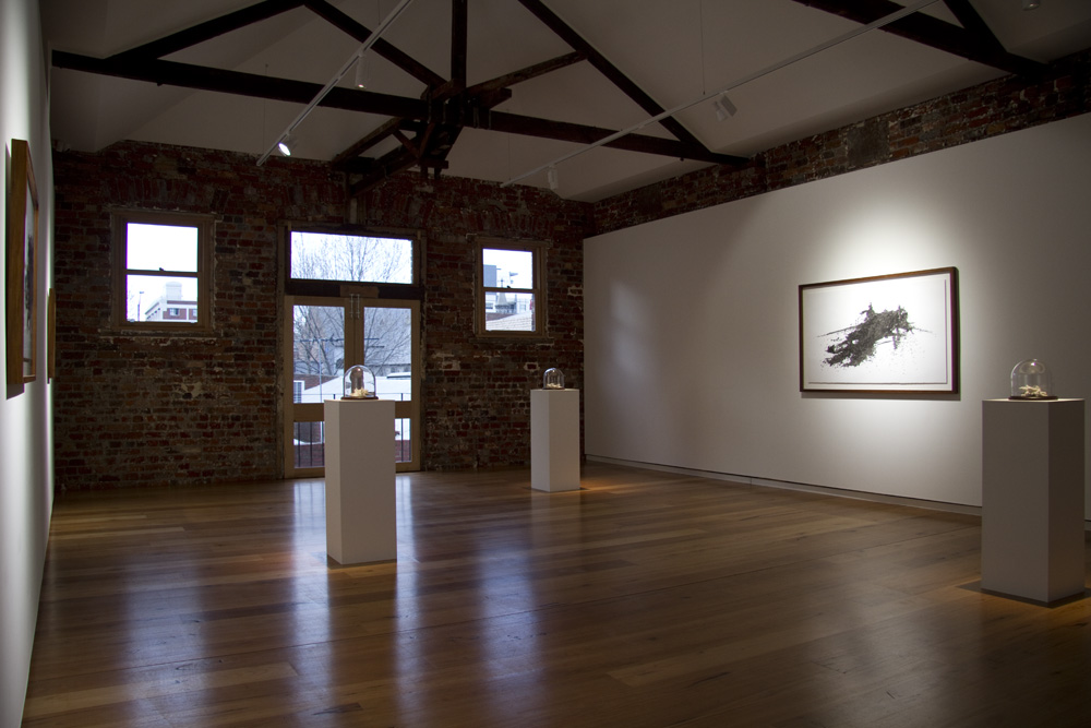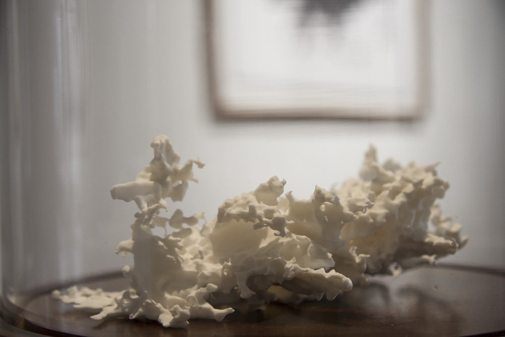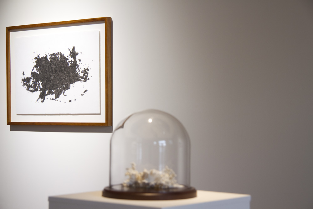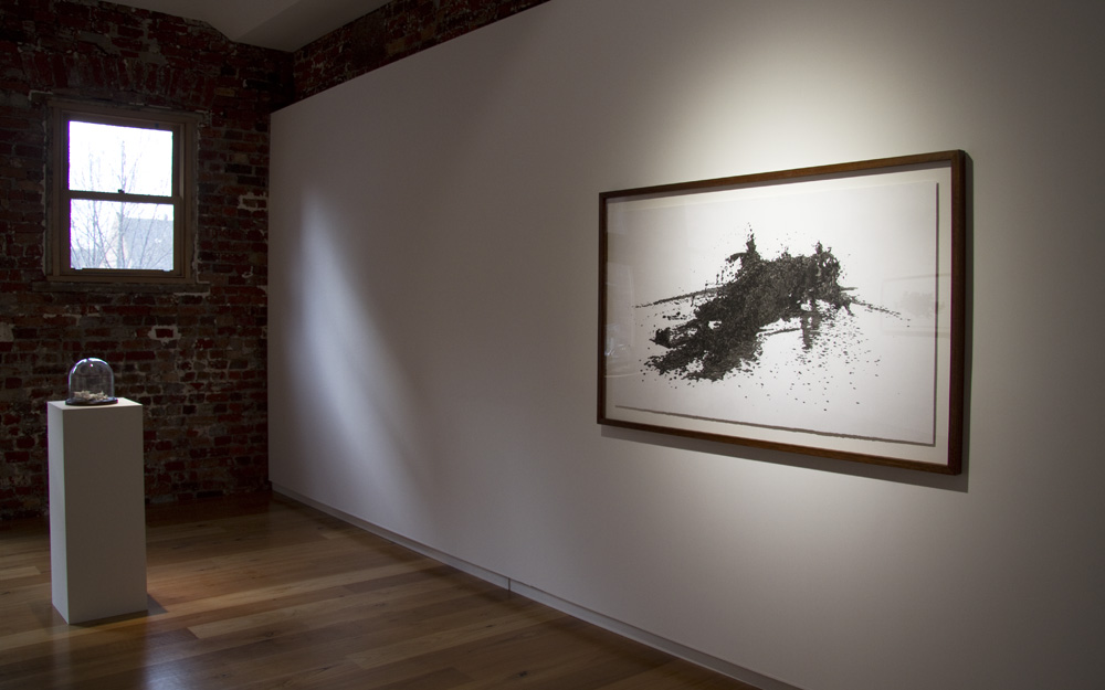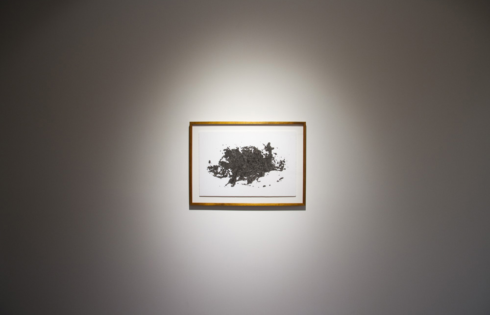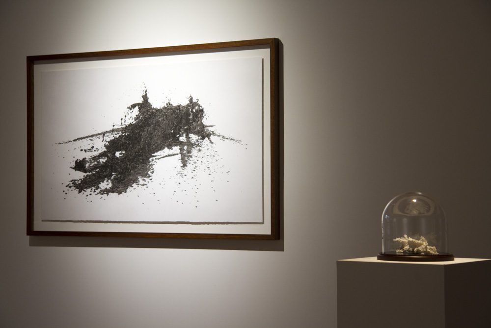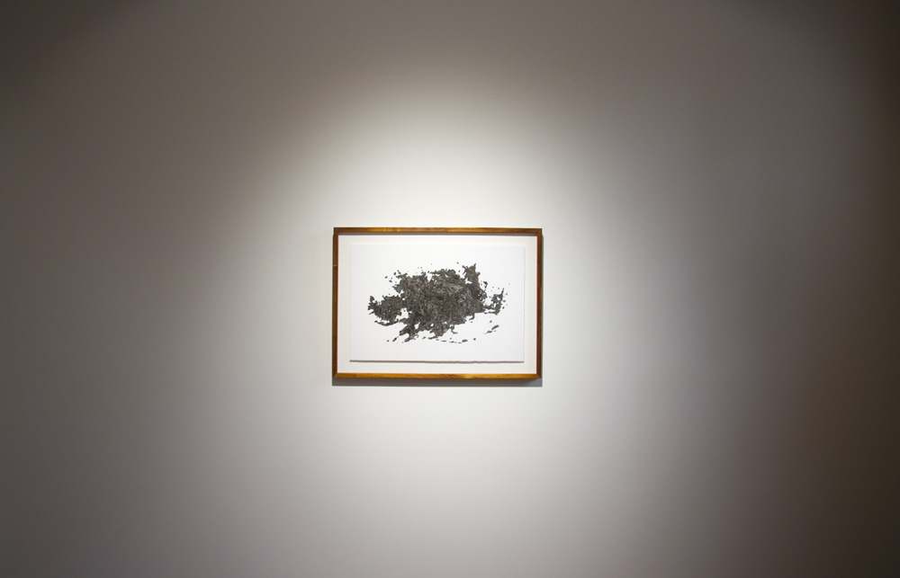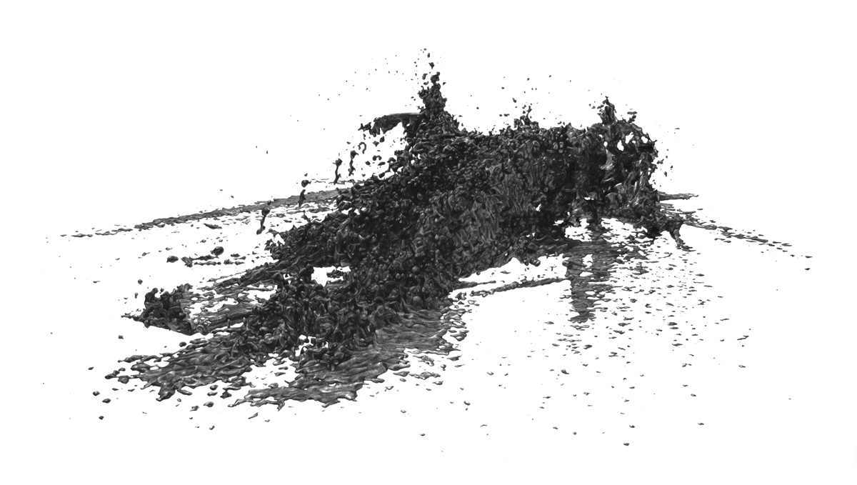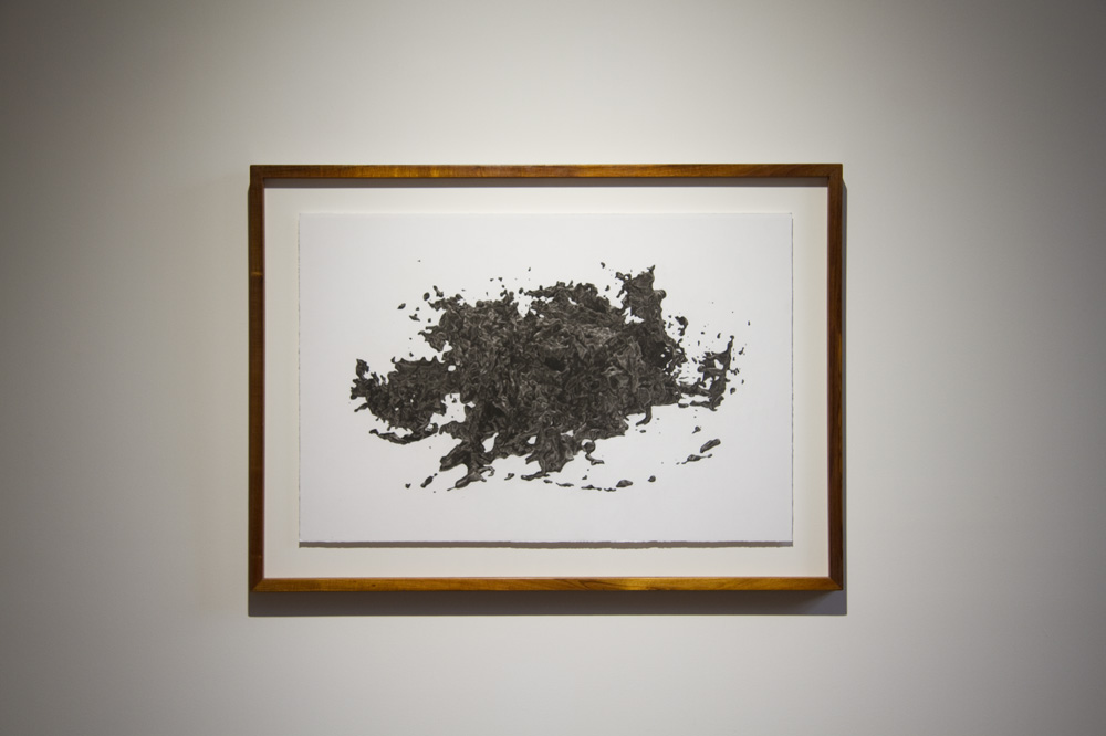 Simon Finn’s new body of complex works are fragments of a simulated tsunami event; a Synthetic Surge. These works continue Finn’s studio-based research into drawing and its connection to digital technologies. Finn uses the sequential images produced by these technologies as preliminary sketches which he extrapolates into a variety of mediums in order to explore spatial and temporal imagery. Synthetic Surge is a collection of meticulous charcoal drawings, digital animation and optical sculptures that reveal the water element of the tsunami event: the devastating virtual force behind the destruction represented in previous works by Finn, such as Pier Collapse Stage 1 (2011). Here, a Synthetic Surge pushes its way through Finn’s process of image construction combining two opposing aspects, detailed systematic assemblage and the concept of destruction. This simultaneous motioning towards assemblage and destruction allows Finn to question notions of temporal sequence and spatial simulation.