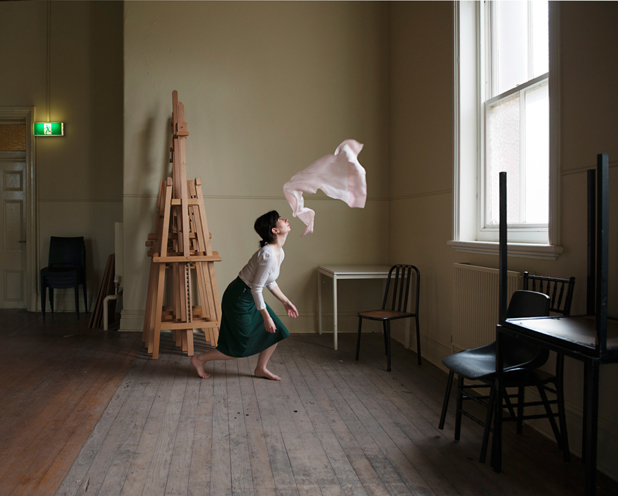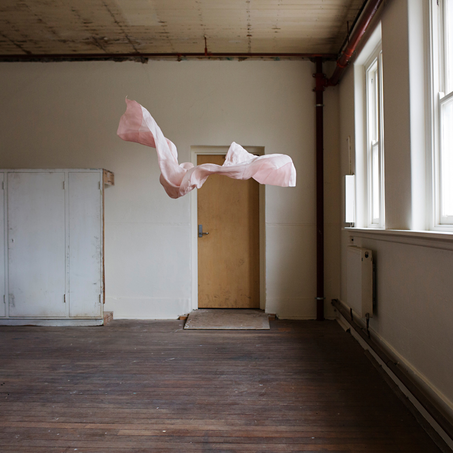 The precision with which Rae captures fleeting moments renders objects without the weight of gravity, as fabric seems to float upon the air. In contrast Rae’s body is imbued with an exaggerated weight as her poised form intersects the fabric at decisive points. The stillness of the photograph is accentuated by the ensnared movement, making the viewer aware of the impossibility of these static figures outside of the photograph.