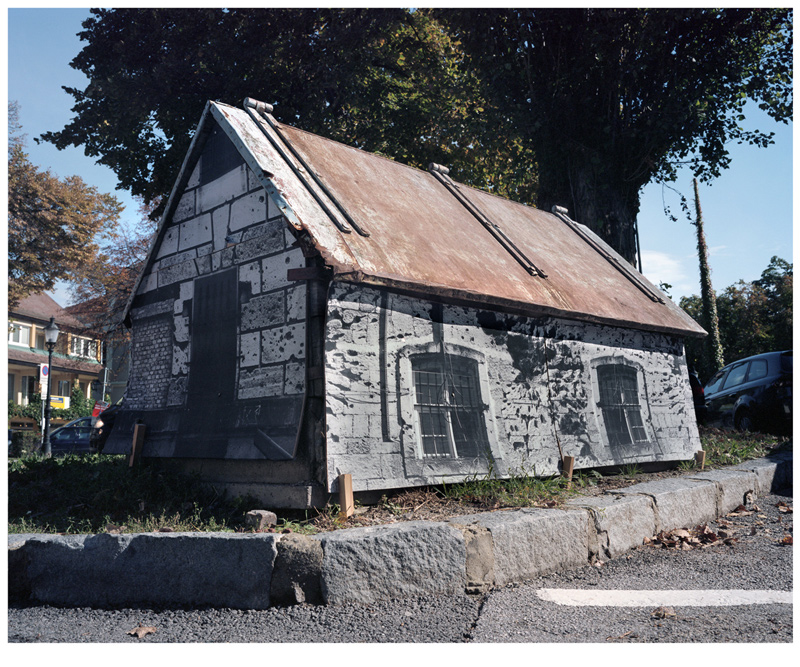 Featured in the gallery’s smaller display area are two of Voller’s earlier works: Raycroft 1 and Raycroft 2. Produced in New Zealand, amongst the detritus of the construction industry, these works, like the European photographs, draw attention to abandoned and forgotten places, and the shifting trends and cycles of the built environment. In the context of New Zealand, which experienced a rapid boom in housing prices in the 2000s, the works have a particular resonance, and intersect with concerns over land value, land use and the desires that drive the housing market. This work also shares with the images from the Constructing Site series a playful exploration of photography and its potential to produce confusions of scale, illusion and unexpected juxtapositions.